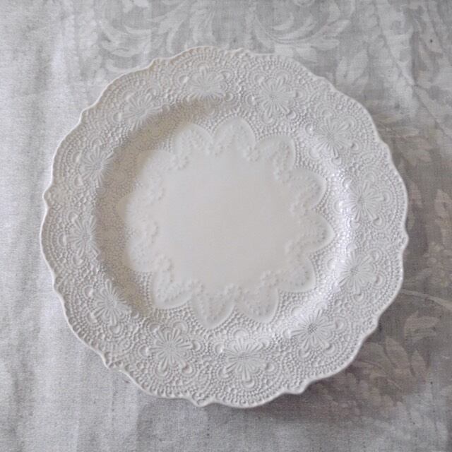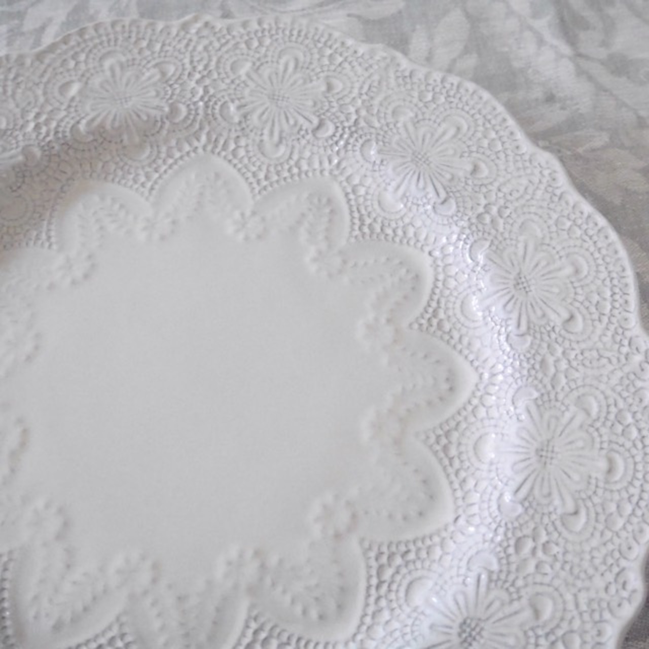 1979年設立のイタリアブランド「ラ・セラミカ」のレース模様のレリーフが美しいクリームカラーの28cmプレート。
